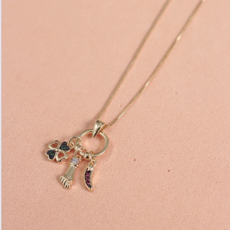 • Collar cadena fina bañada en oro 18k • Colgante argolla con tres dijes centrales con cubics engarzados: trébol, manito y ají • Largo 45cm • Las piezas bañadas en oro son, por defecto, más delicadas y pueden perder el color con el tiempo. El baño puede desvanecerse por diferentes motivos: productos químicos utilizados para el cuidado de la piel, el nivel de transpiración o el ph natural de la piel. Recomendamos no usarlas bajo el agua y evitar que perfumes y cremas toquen directamente las joyas.